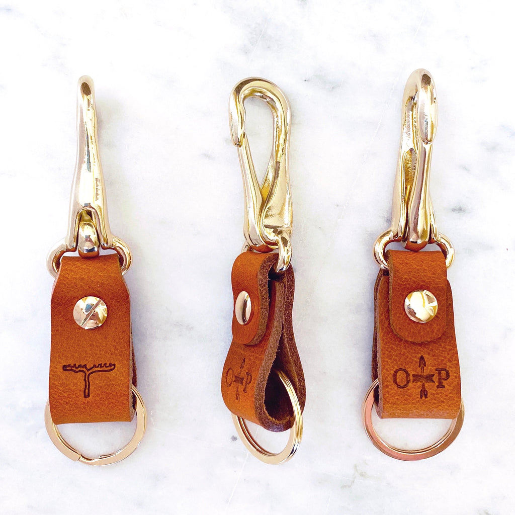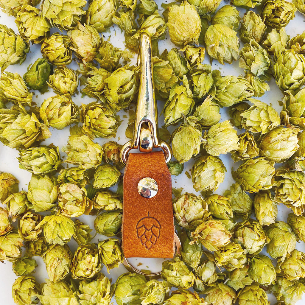 Each keychain is constructed from vegetable-tanned Italian brown leather with a solid brass clip, rivet and split ring hardware. The leather is dyed, burnished and waxed by hand with each keychain stamped with one of three icons: the Beer Hop, Grapevine or Cannabis Leaf.
