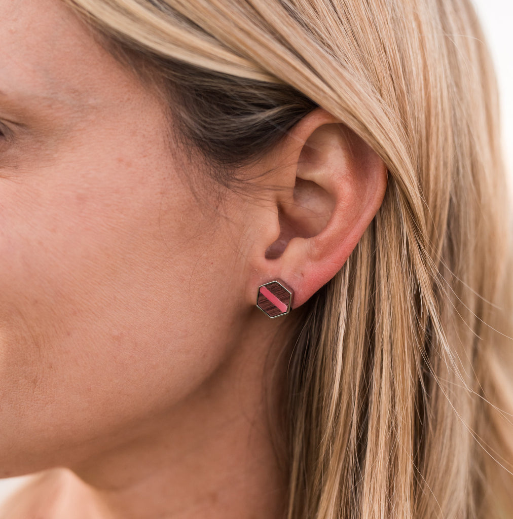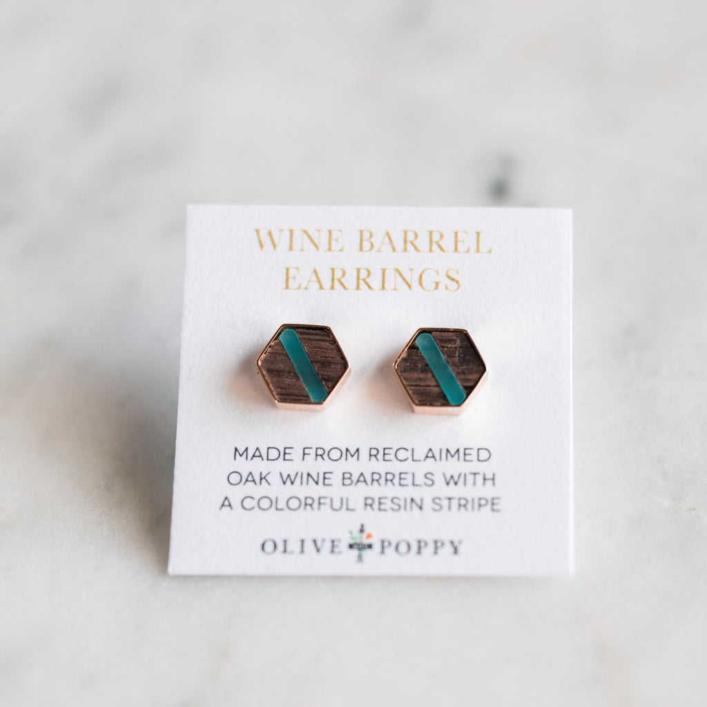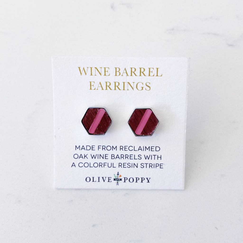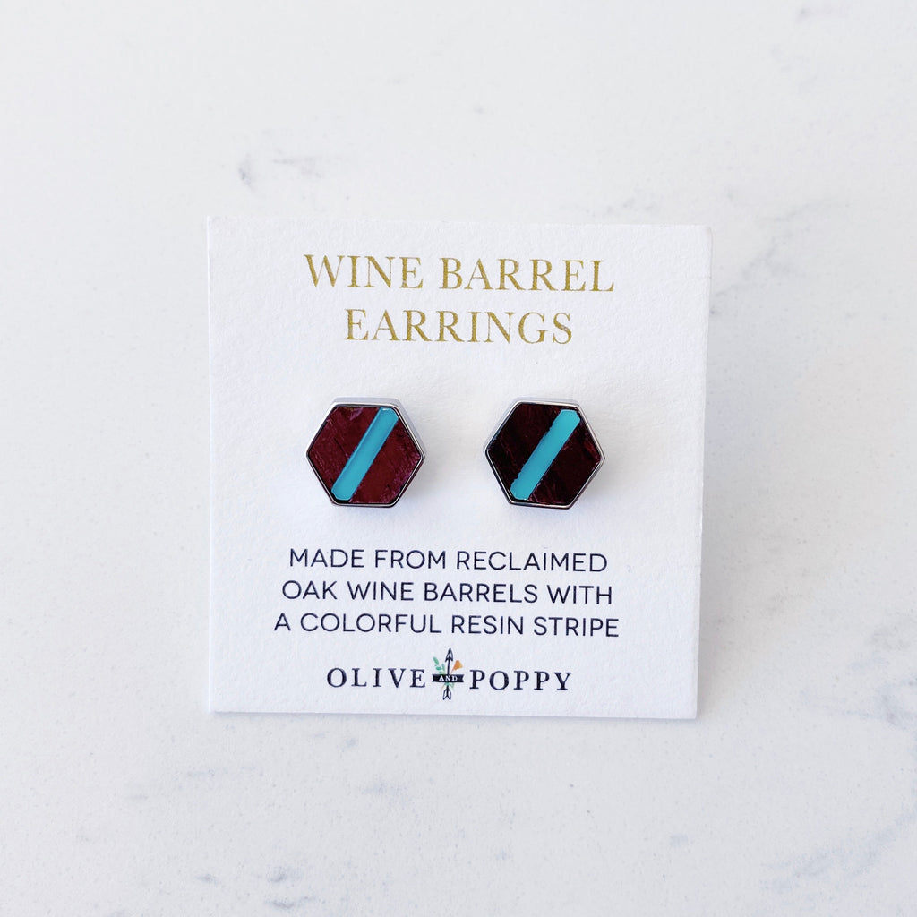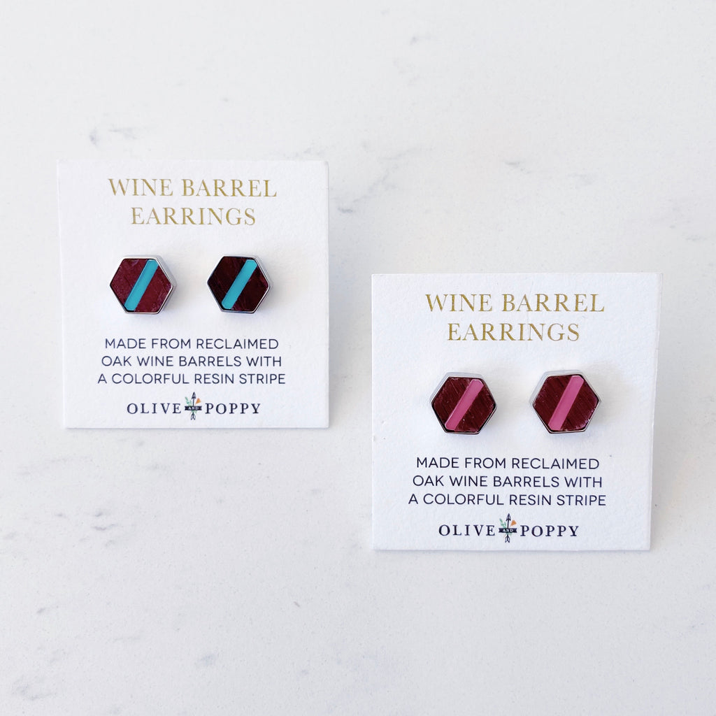 Made from reclaimed oak wine barrel wood with a colorful Lucite stripe, these stylish hexagon earrings are a little larger than our original Barrel Earring design. Their elegant geometric design make them the perfect wine country statement accessory!