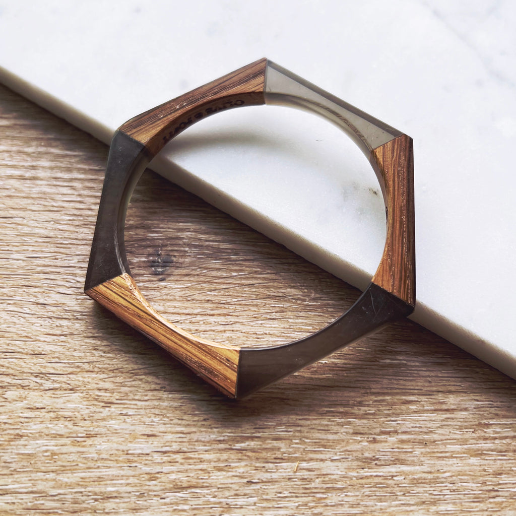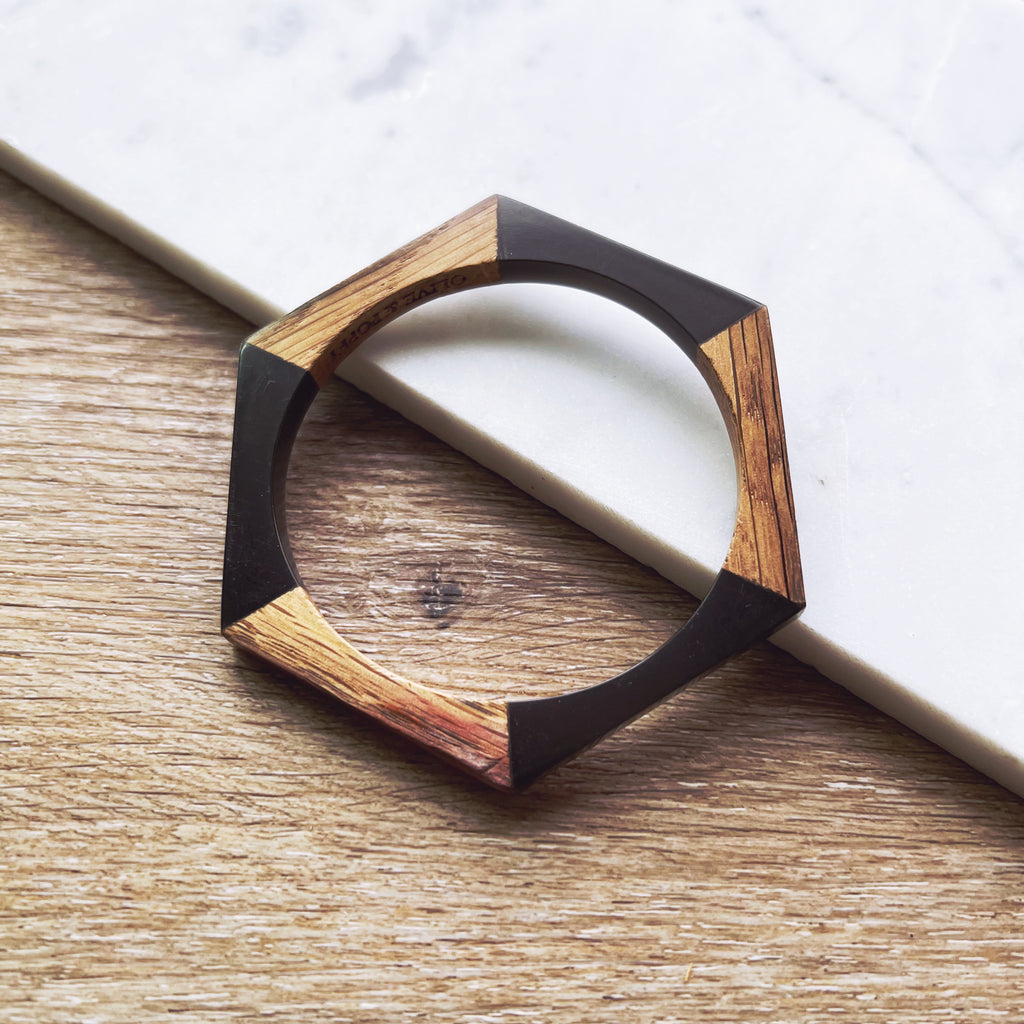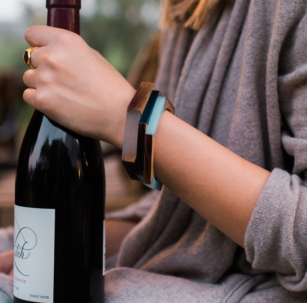 The Barrel Bracelets are made from alternating segments of reclaimed oak wine barrel wood and colorful lucite. Streaks of red wine stain are still visible in pieces of the wood.